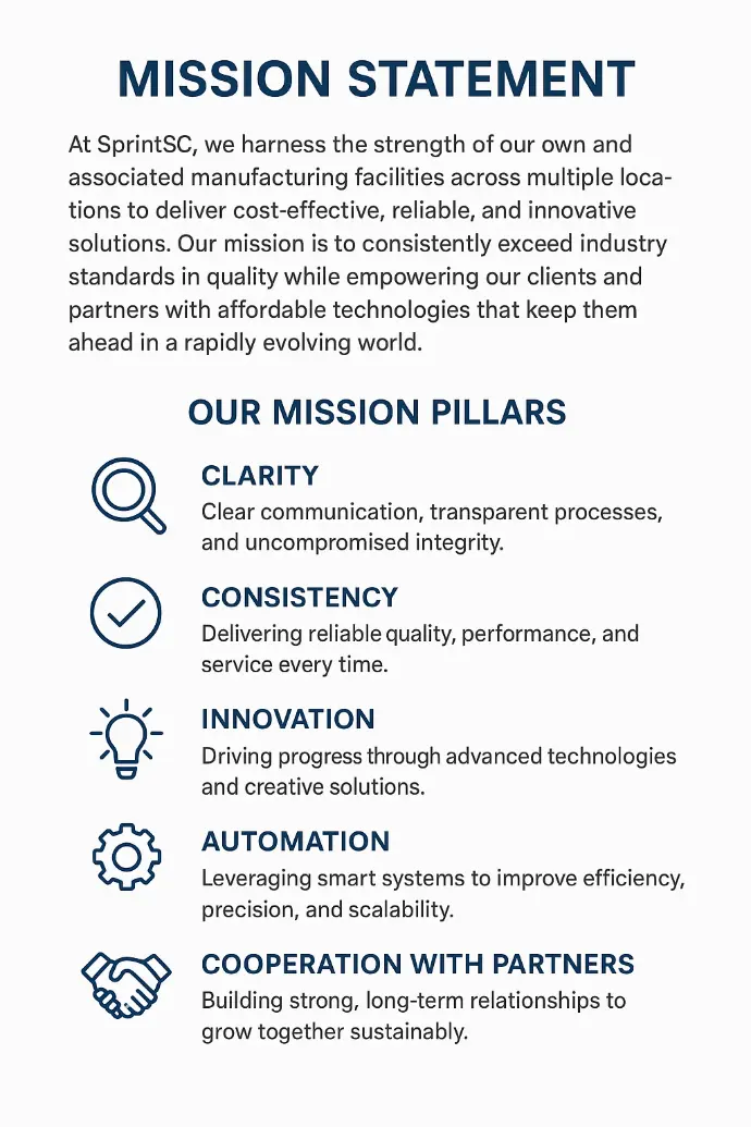 “At SprintSc, we harness the strength of our own and associated manufacturing facilities across multiple locations to deliver cost-effective, reliable, and innovative solutions. Our mission is to consistently exceed industry standards in quality while empowering our clients and partners with affordable technologies that keep them ahead in a rapidly evolving world.”